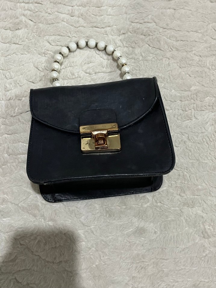 Siyah deri kadın çanta, tokalı kapama ve inci sapıyla modern klasik ve Paris tarzını birleştiriyor. Günlük kullanıma uygun.
