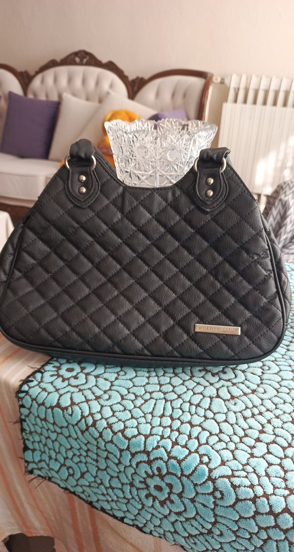 Parlak siyah deri kadın çanta, tokalı saplara sahip. Parisli gotik tarzından esinlenmiş kapitone desensiz tasarım, günlük kullanıma uygun.