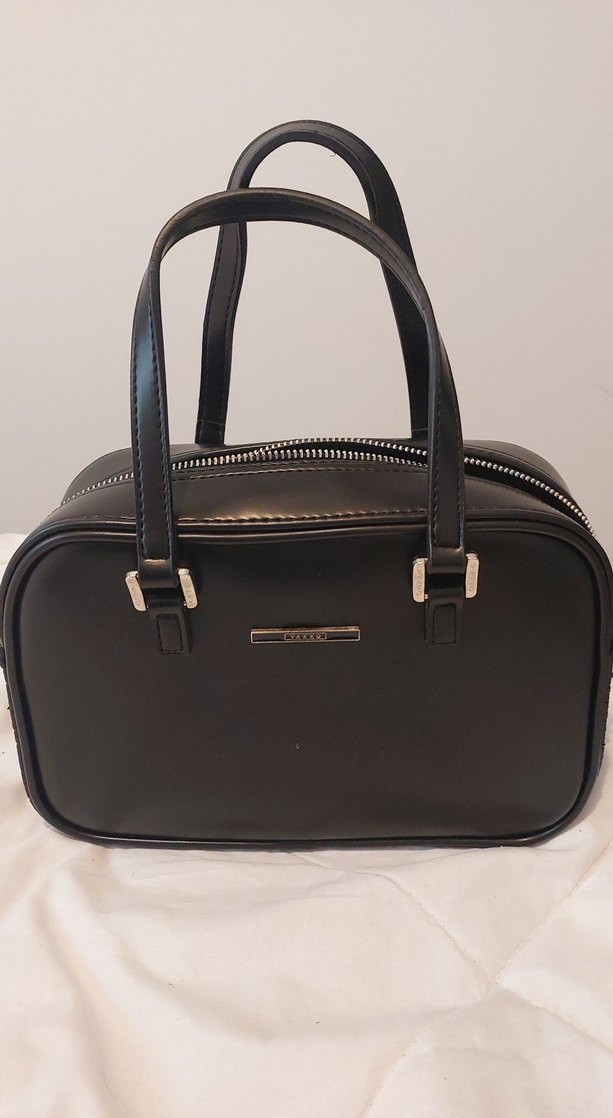 Siyah deri kadın çanta, fermuarlı. İçte 1 adet fermuarlı, yan askısı var. İthal Vakko çanta Hiç kullanmadım.