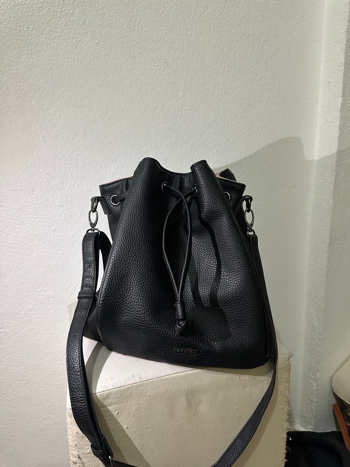 Siyah deri kadın çanta, tokalı ve minimalist tasarıma sahip. Günlük kullanım için uygun, desen içermeyen şık bir model.