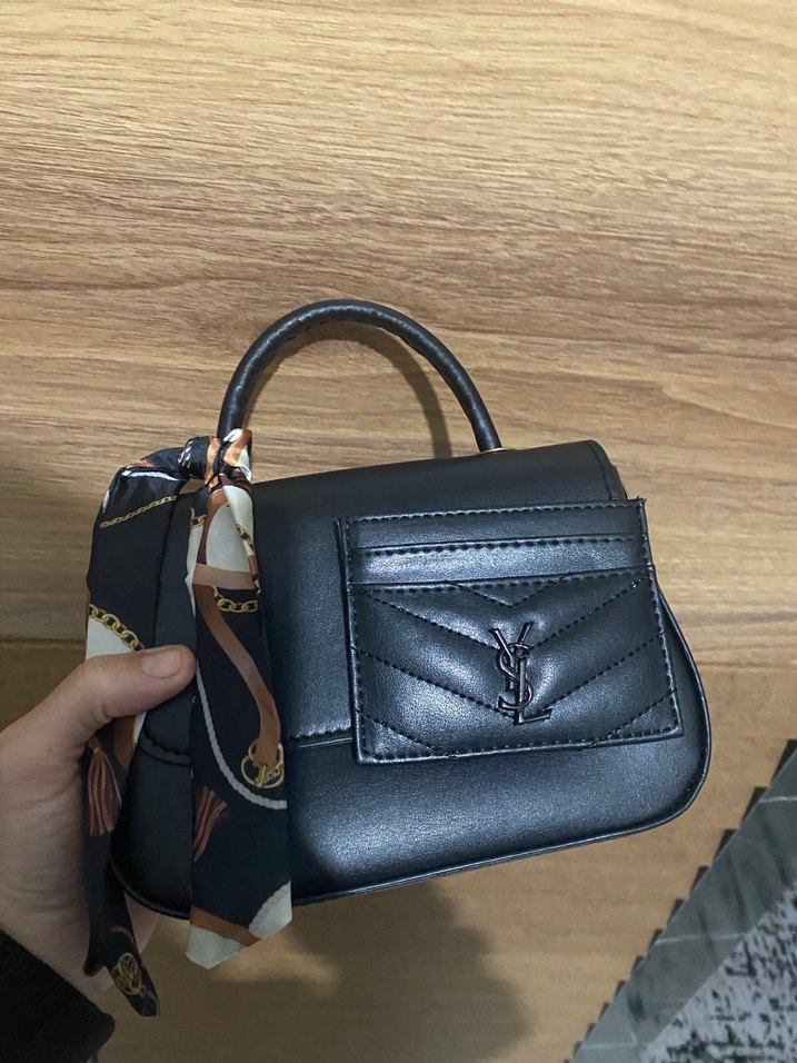 Siyah deri, tokalı ve baskılı fular detaylı kadın çantası, modern klasik tarzda, günlük kullanıma uygun.