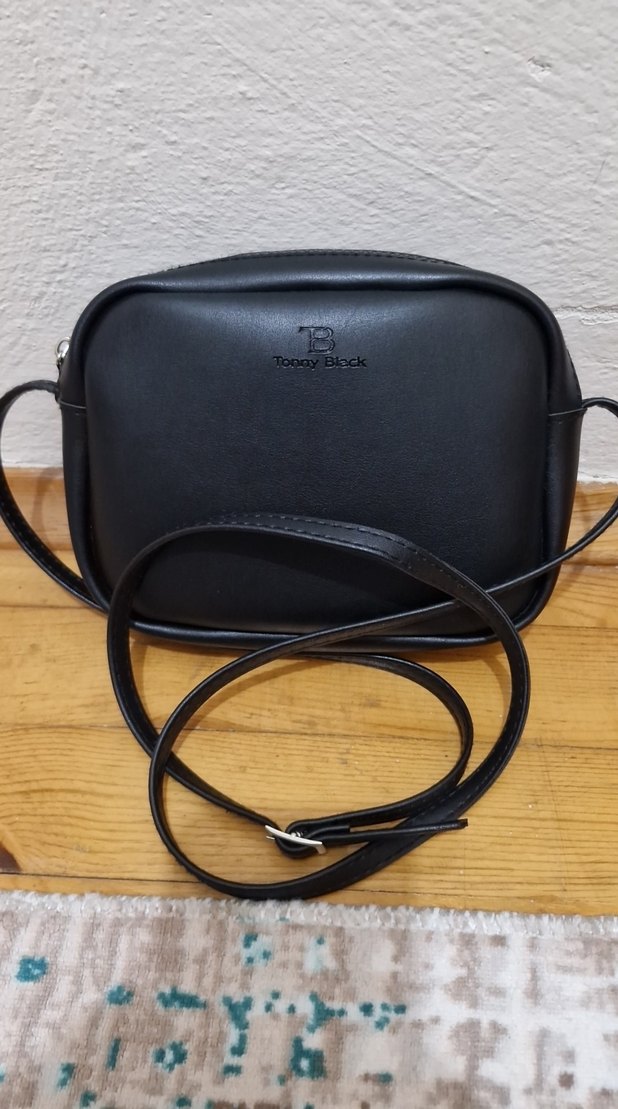 Siyah deri çapraz askılı kadın çantası, minimal tasarım ve tokalı askıya sahip. Günlük sokak stiline uygun, desensiz ve sade görünümlü. Sıralı kullanılmıştır deformesi yoktur.