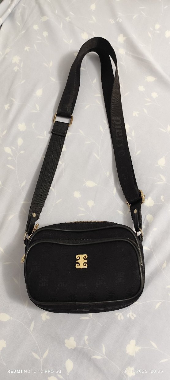 Siyah deri, tokalı askıya sahip minimalist çapraz çanta. Günlük kullanıma uygun, desen içermeyen ve şık tasarımlı.