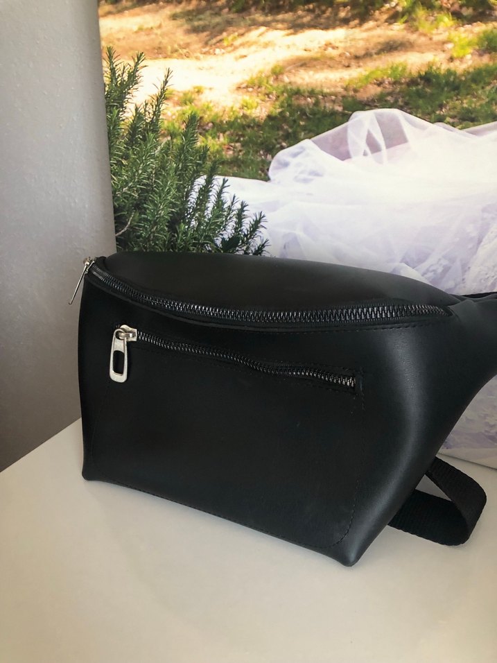 Siyah deri çapraz çanta, fermuarlı cepleri ve minimalist tasarımıyla günlük kullanım ve trend sokak modasına uygundur.