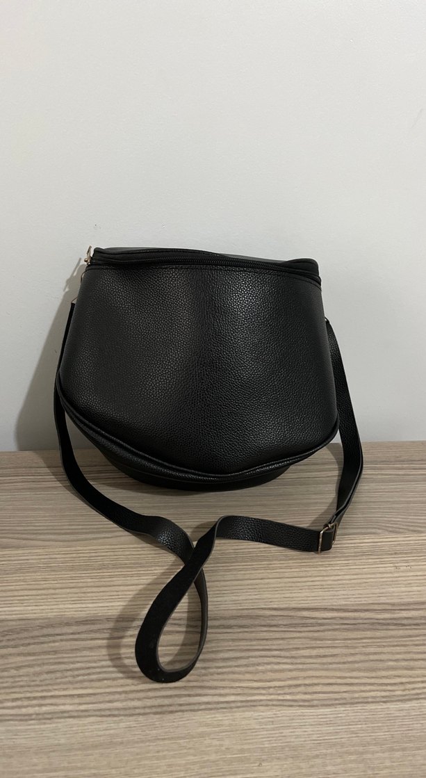 Siyah deri çapraz çanta, tokalı detaylı, minimalist ve biker tarzında. Günlük kullanıma uygun, desensiz sade tasarım.