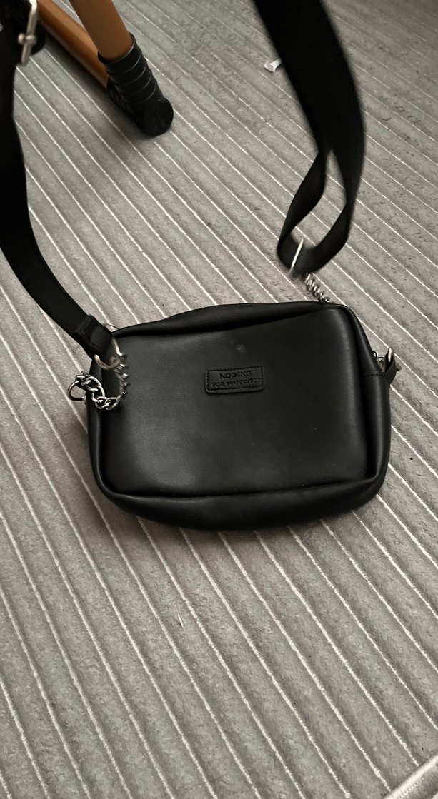 Siyah deri çapraz çanta, tokalı askıya sahip, günlük kullanıma uygun sade ve şık tasarım.