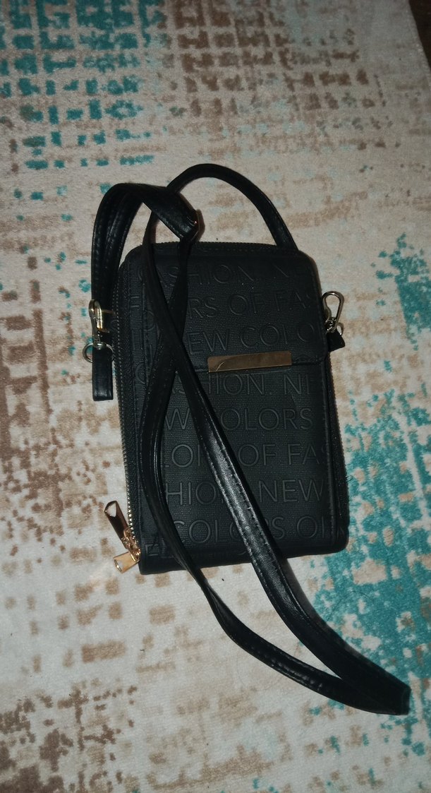 Siyah deri, baskılı yazılı ve tokalı askılı çapraz çanta, günlük sokak stiline uygun.