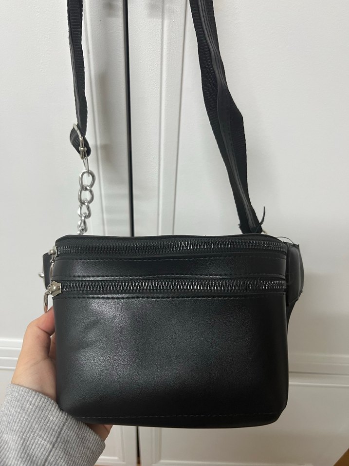 Siyah deri çapraz çanta, fermuarlı bölmeleriyle minimalist sokak stili ve günlük kullanıma uygun.