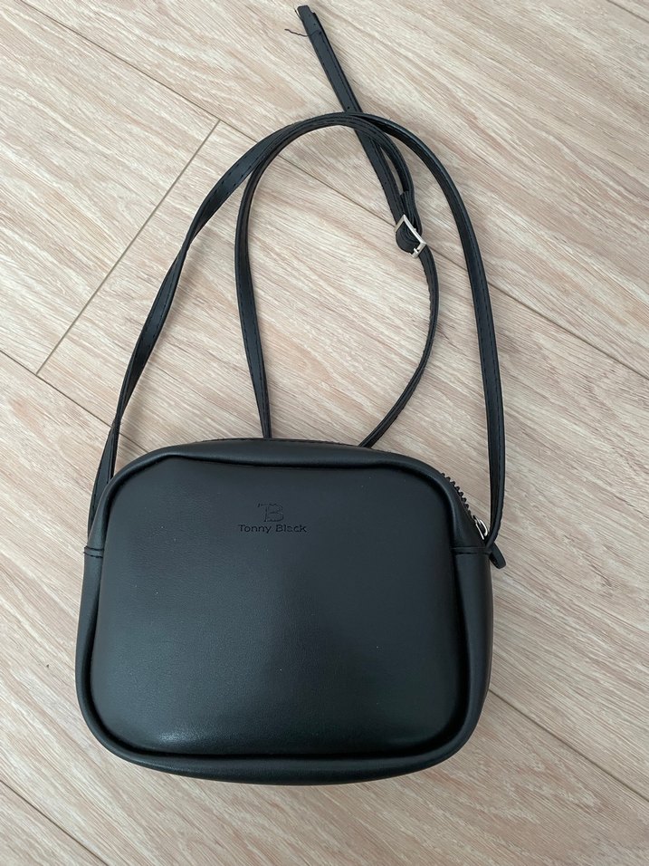Sade ve desensiz siyah deri çapraz çanta, ayarlanabilir tokalı askıya sahip. Günlük kullanım için minimalist tarzda.