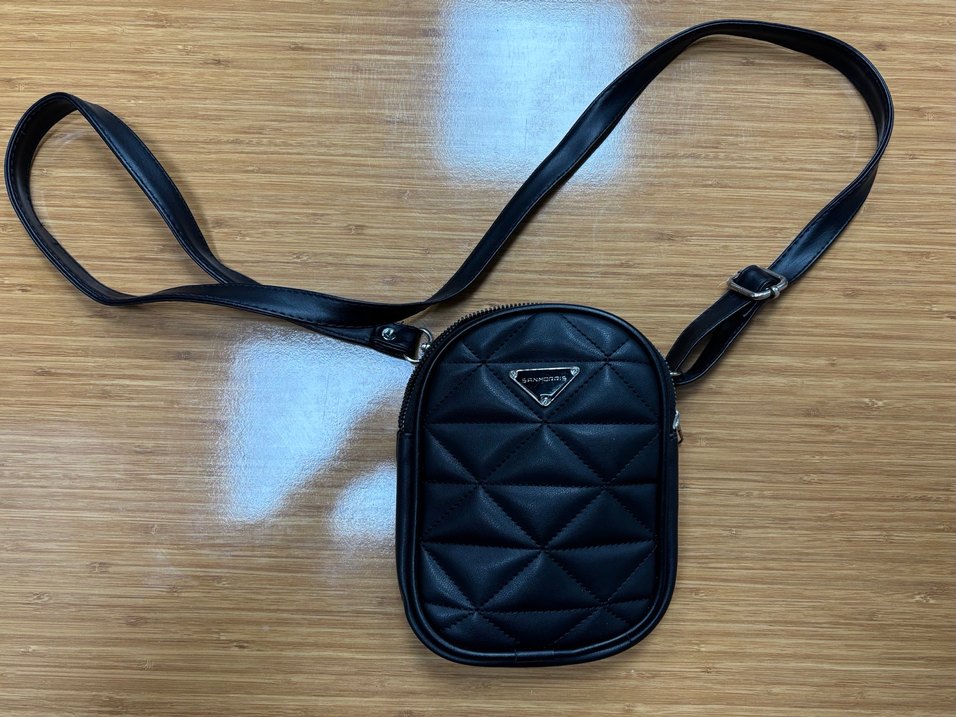 Siyah deri, kapitone desenli ve tokalı ayarlanabilir askılı kadın çapraz çanta. Rahat sokak stili için uygundur.