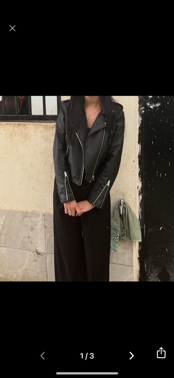 Siyah deri, kesik yaka ve fermuarlı detaylara sahip kadın ceket. Normal kesim ve askılı kollarıyla günlük sokak stiline uygundur.