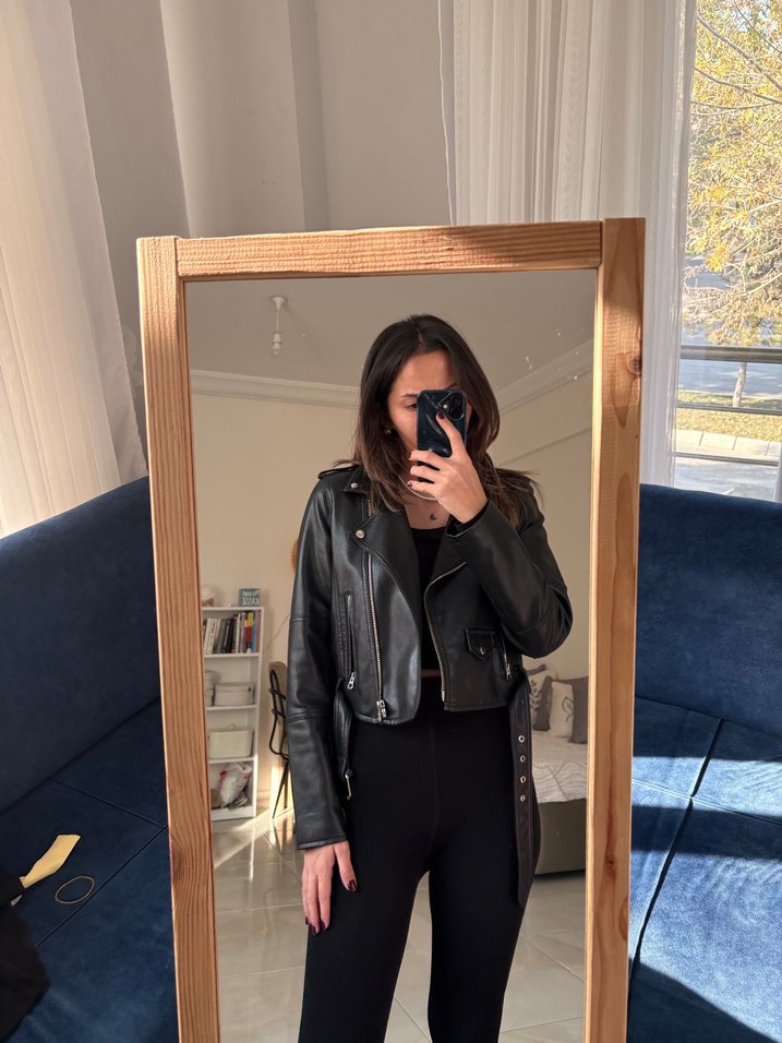 Siyah deri ceket, ince kesim, notalı yaka ve uzun kolludur. Tokalı detaylarıyla sokak stiline uygundur.