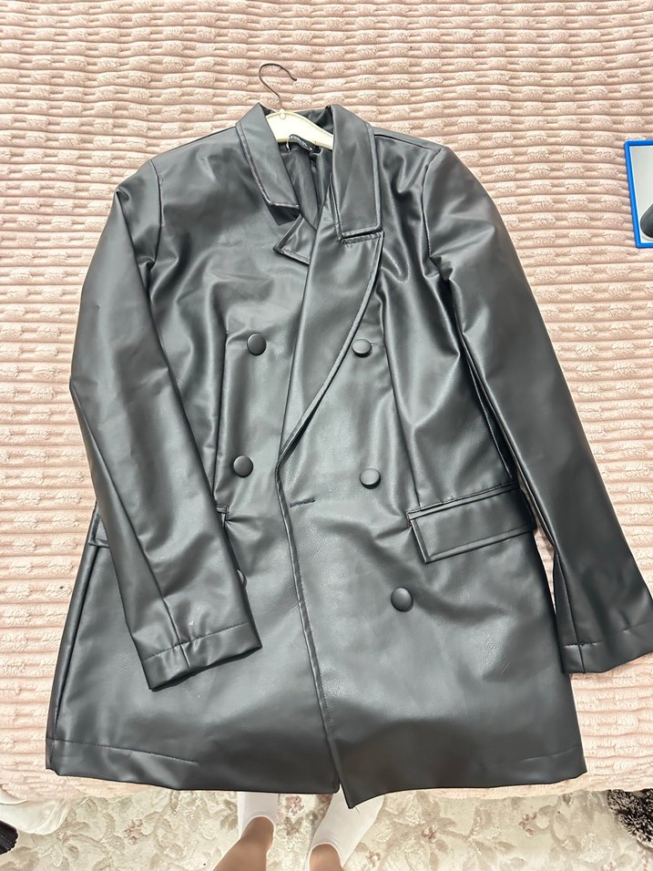 Siyah deri kadın ceket, kesik yaka ve düğmeli ön detaylarla regular kesime sahiptir. Midi boy ve uzun kolludur, ofis için şık ve rahat bir tercihtir.