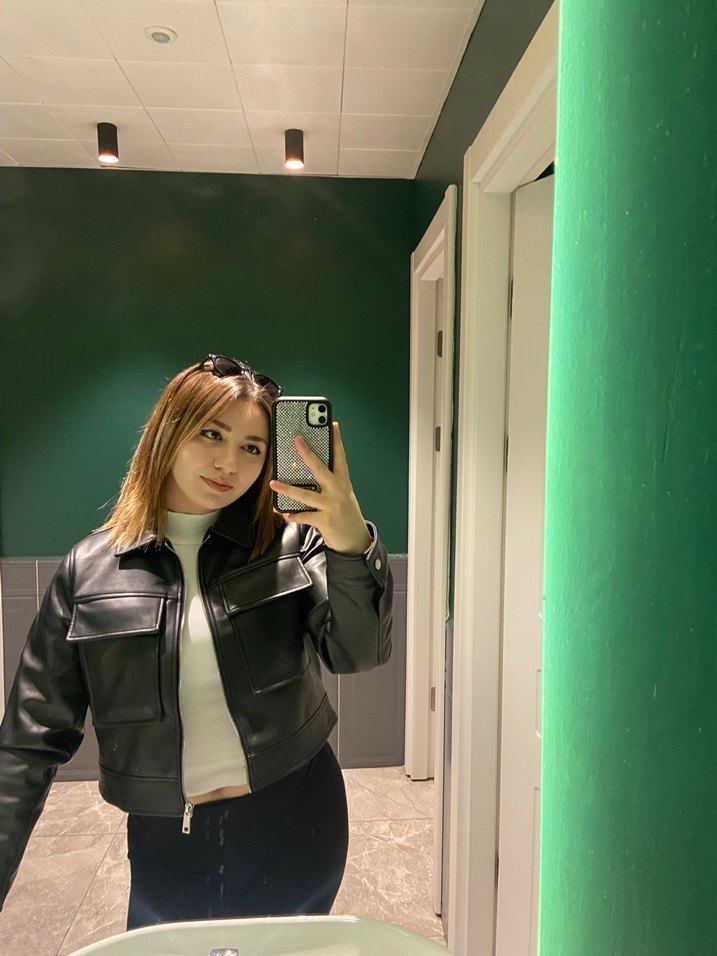 Parlak siyah deri, uzun kollu, straplez yakalı, vücuda oturan kadın ceket. Sokak stiline uygun, günlük kullanıma ideal. Çok az kullanıldı yeni gibi