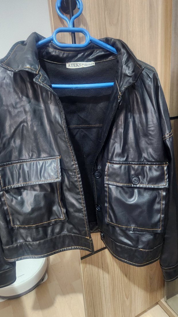 Siyah deri, düğmeli, notched lapel yakalı, bol kesim kadın ceket. Strappy kollu ve normal midi boyda, gündelik kullanım için uygun. Marka: ATEKS. İnce Mont