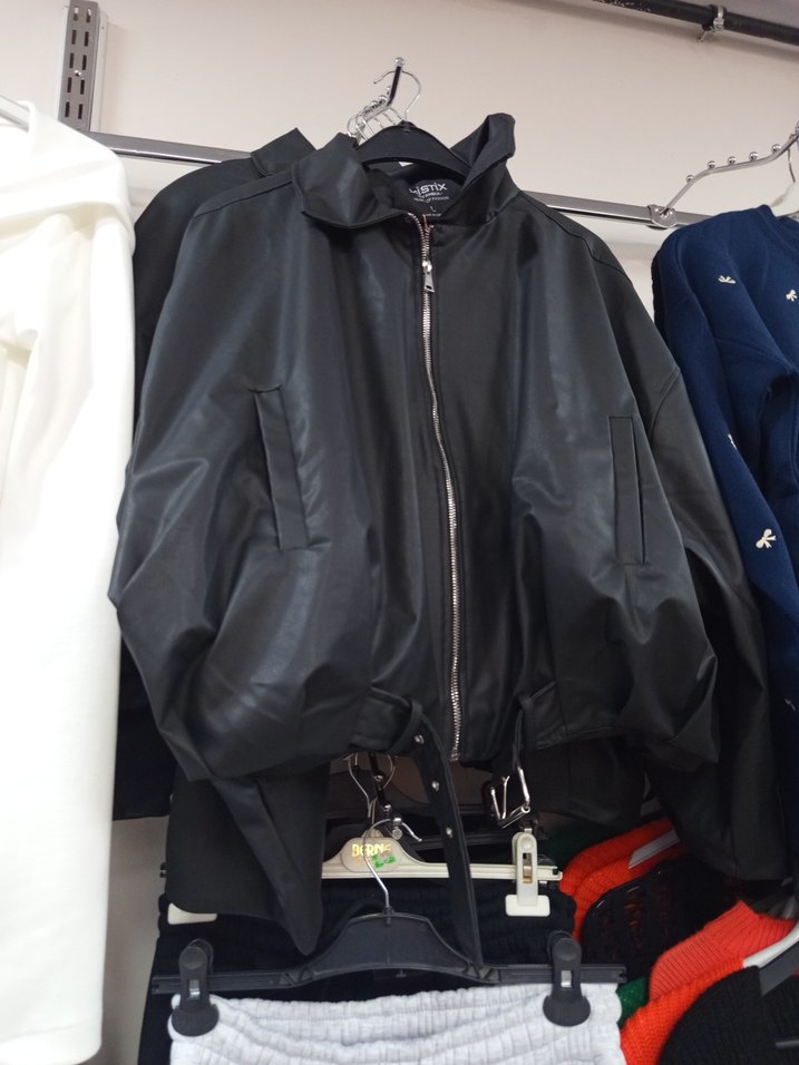 Yüksek yakalı, fermuarlı siyah deri kadın ceket. Salaş kesim ve askılı kollarla sokak stiline uygun, midi boyda ve desensiz.