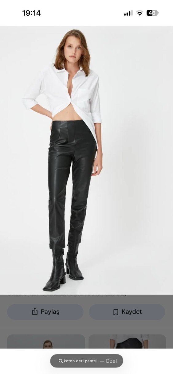 Siyah deri, midi boy, regular fit cigarette pantolon. Ofis için uygun, zahmetsiz şıklık sunar. Modern tarzda rahat ve şık. Dolapta küçük bir defosu oluşmuş fotoğrafı eklendi