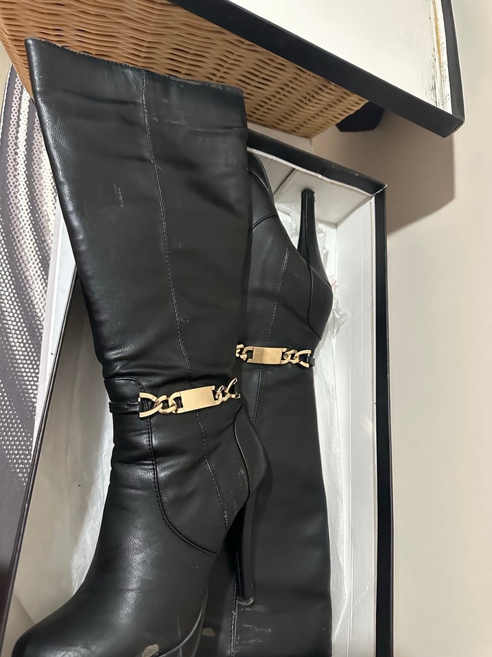 Siyah deri çizmeler, stiletto topuklu detaylıdır. Kemerli tasarımıyla cesur gotik stil sunar. Günlük kullanım için uygundur.