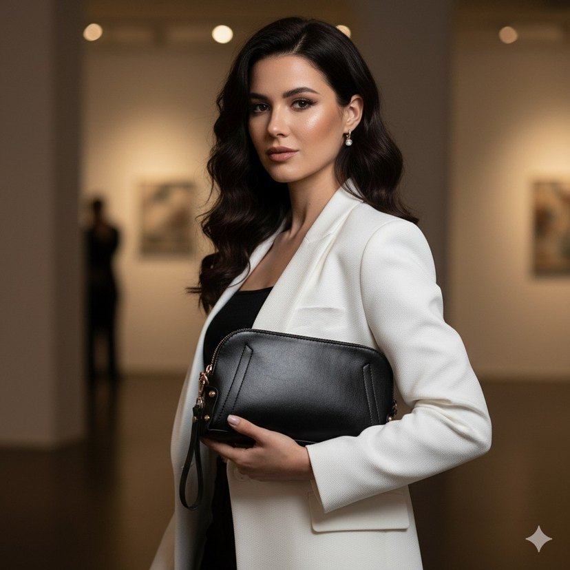Siyah deri, desen içermeyen modern klasik tarzda kadın clutch çanta. Ofis ortamına uygun, zarif ve kullanışlı bir tasarım.
