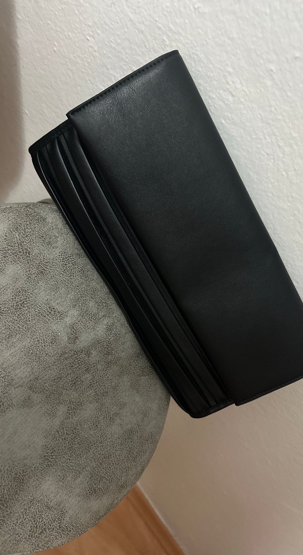 Ofis kullanımı için uygun, fermuarlı kapamalı siyah deri kadın clutch çanta, minimalist ve çağdaş tasarıma sahiptir.
