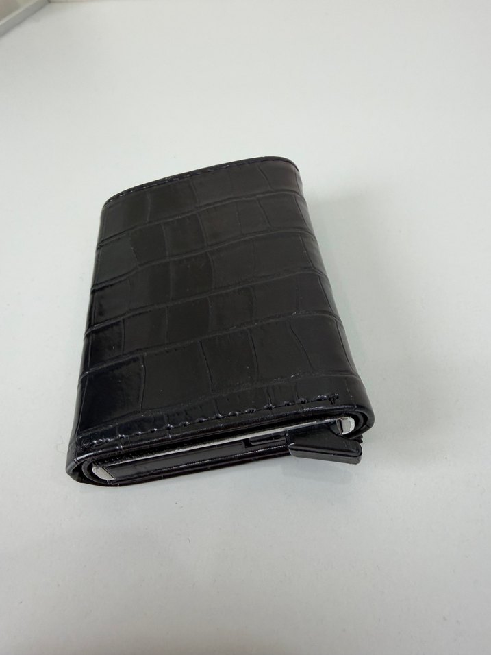 Siyah deri desenli yüzeye sahip kadın cüzdan, sokak giyim tarzına uygundur.