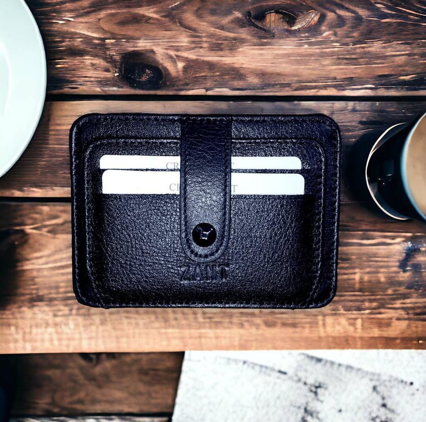 Siyah deriden yapılmış, tokalı askıya ve çoklu kart bölmelerine sahip kadın cüzdanı. Günlük kullanım için uygun, sade ve baskılı tasarımlı, koyu tonlarda iş tarzında.