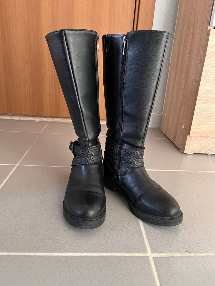 Siyah deri dizüstü botlar, sivri topuklu ve tokalı detaylara sahip. Gotik tarz için şık ve günlük kullanıma uygun.