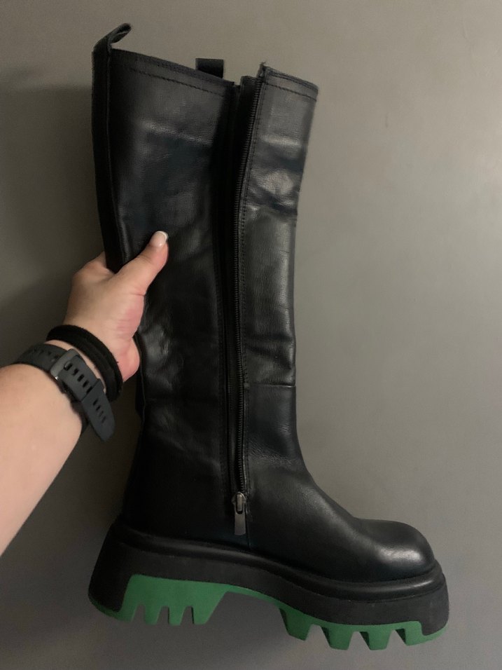Siyah deri çizme detaylara sahip. Gotik ve sokak stili için chunky yeşil tabanlı.