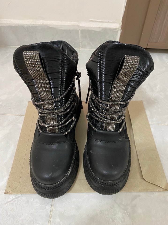 Siyah deri, dolgu topuklu, tokalı ve desen içermeyen kadın goth botları, günlük kullanıma uygun ve rahat.