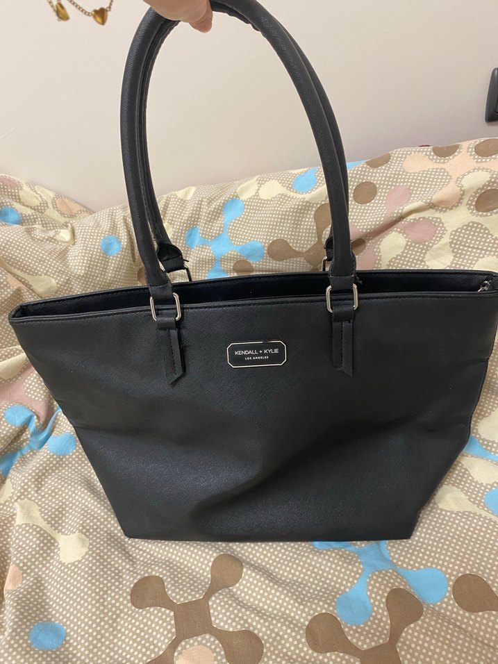 Siyah deri kadın el çantası, fermuarlı kapama ve baskılı desene sahip, Paris tarzı sokak modasına uygun şık bir modeldir. Boyu 27cm, eni 48cm içi oldukça geniş tam altında köşelerde soyulma var onun haricinde temiz