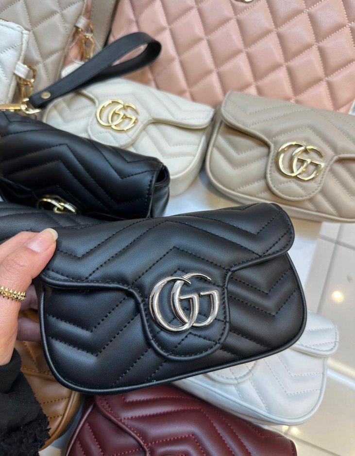 Siyah deri kadın çantası, tokalı ve kapitone desenli, altın GG logosuyla trend sokak tarzına uygun.