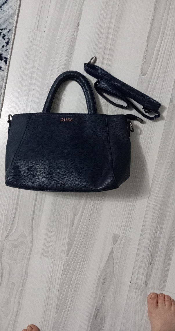 GUES markalı siyah deri kadın çantası, minimal tasarım ve tokalı detaylara sahip, çıkarılabilir askısı ile günlük sokak stiline uygun.