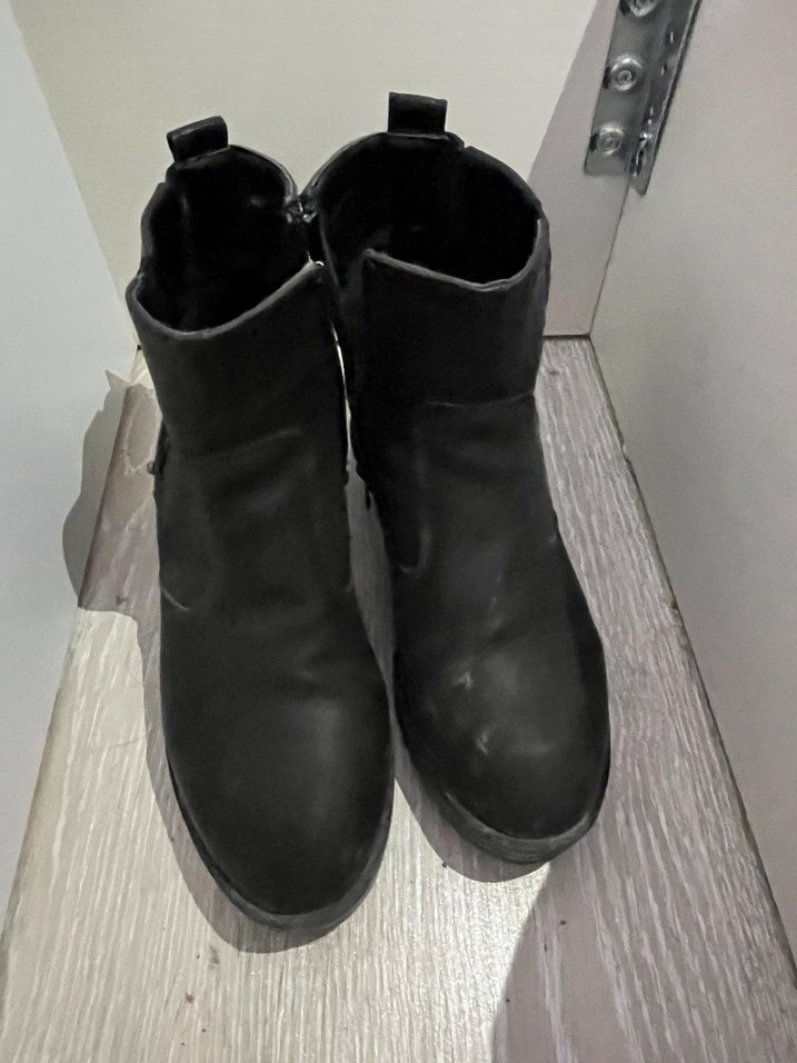 Siyah deri, gizli topuklu ve tokalı kadın botları, günlük kullanım için uygun sade ve desensiz tasarıma sahiptir.