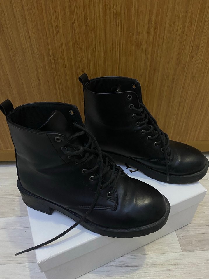 Siyah deri, tok topuklu, bağcıklı ve tokalı kadın botu, trendi günlük tarz için uygundur.