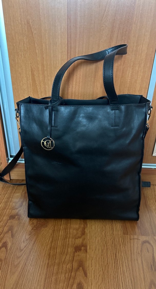 Siyah deri, tokalı kadın çantasıdır. İş ve günlük kullanım için uygundur, trend goth tarzına sahiptir.