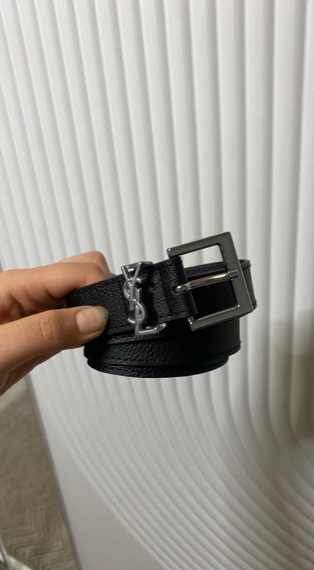 Gümüş tokalı ve YSL logo detaylı siyah deri kemer, trend sokak giyimine uygundur.