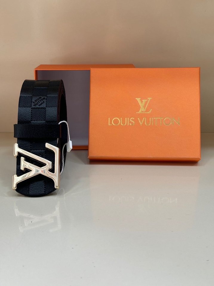 Louis Vuitton'un kare desenli siyah deri kadın kemeri, belirgin gümüş LV tokası ve sokak stilini yansıtıyor.