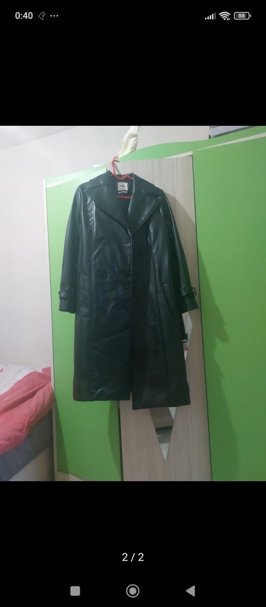 Siyah deri, kemerli ve uzun kesim kaban, notched lapel yakalıdır. Street style için uygun, regular fit ve desensizdir. Uzun kolludur.