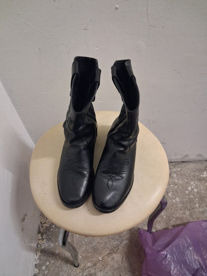 Siyah deri, kemerli, wedge topuklu kadın botları, minimalist gotik tarzıyla günlük kullanım için uygundur.