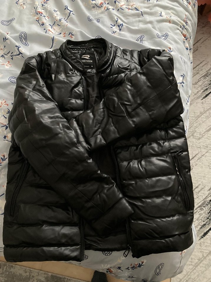 Siyah deri, fermuarlı, yüksek yakalı, uzun kollu, gençlere uygun, normal uzunlukta, rahat ve şık kadın kışlık mont.