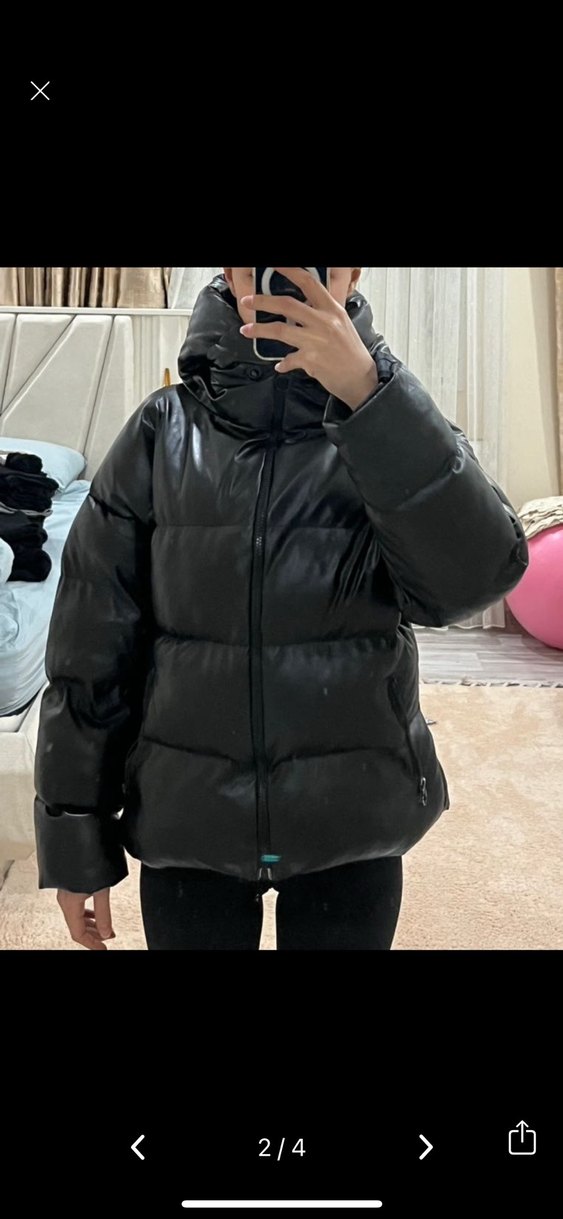 Siyah deri kadın kışlık şişme mont, yüksek yakalı ve fermuarlı. Uzun kollu, vücuda oturan kesimiyle günlük kullanıma uygun sıcak tutar.