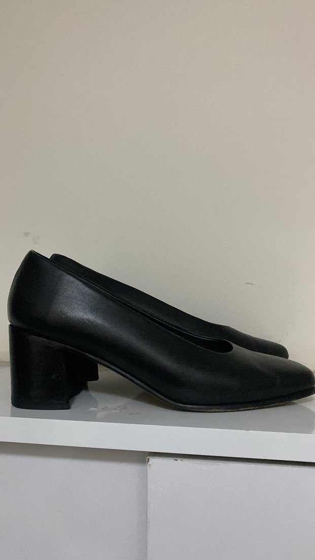 Siyah, kauçuk blok topuklu kadın klasik ayakkabı. Minimalist ve çağdaş tarzda, ofis için uygun, zahmetsiz şıklık ve klasik zarafet sunar.