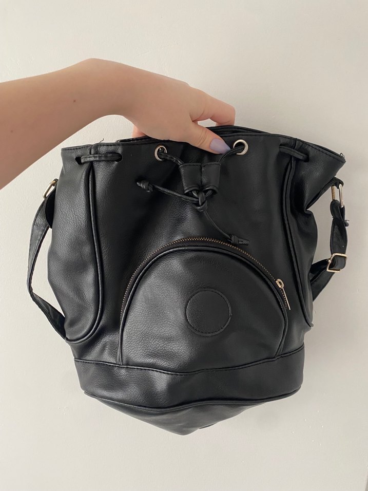 Siyah deri kol çantası, tokalı ipli kapama ve önde fermuarlı cep içerir. Minimalist ve günlük kullanıma uygun.