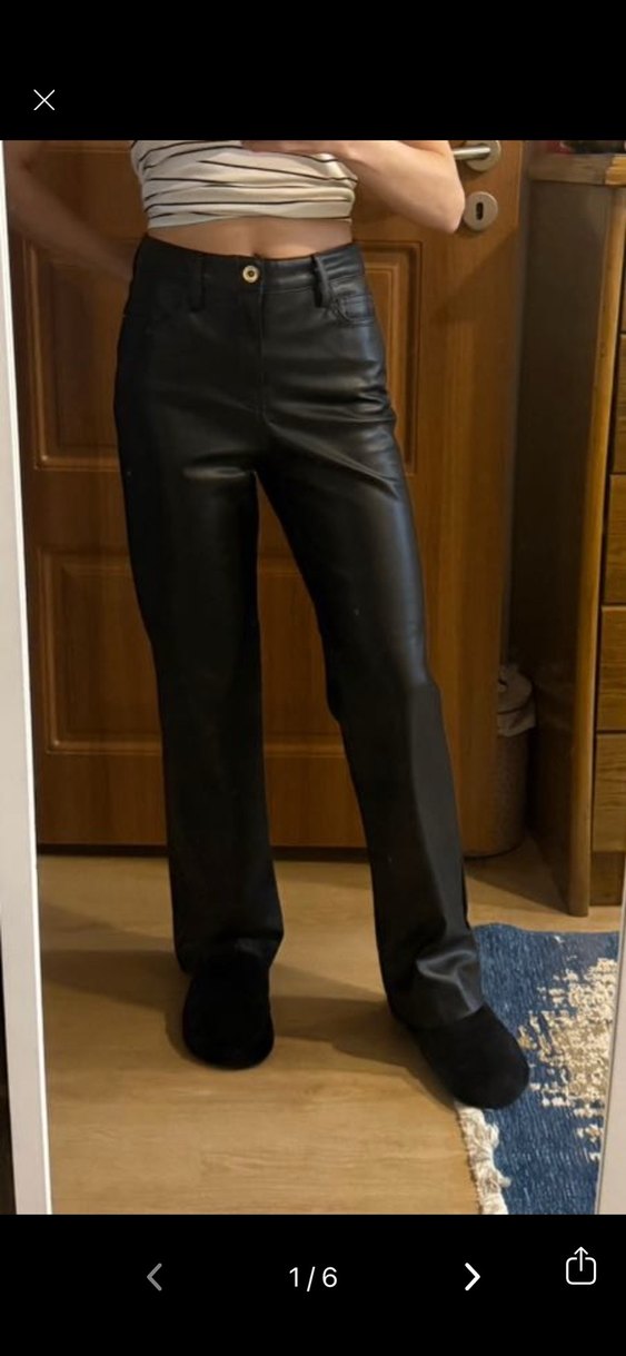 Siyah deri kumaştan, normal boy ve regular fit kesime sahip, ofis için uygun rahat ve şık kadın pantolonu. Zaradır markası 1-2 kez giyildi hiçbir deformesi yoktur yeni gibi