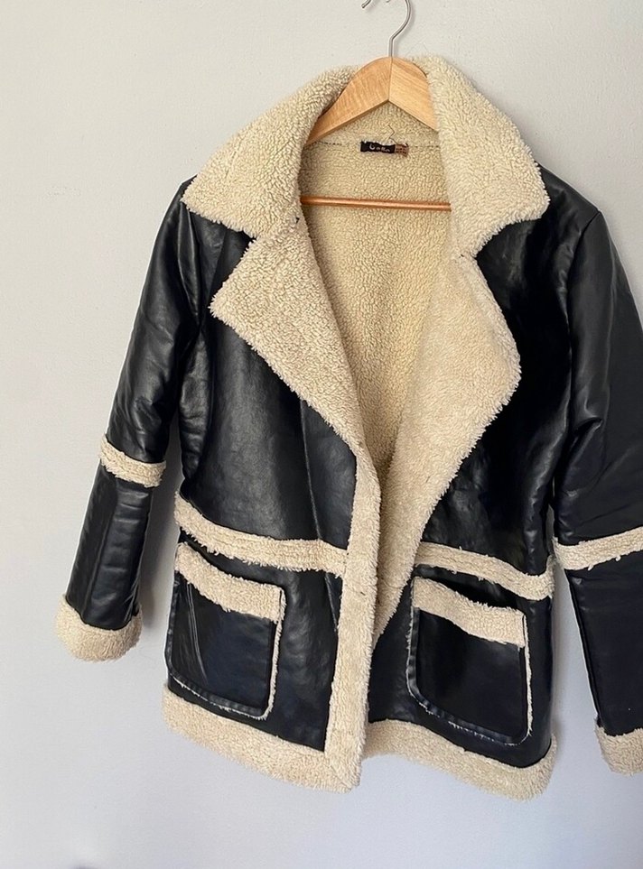 Siyah deri, kürklü detaylı kısa kesim kadın ceket. kusuru yoktur