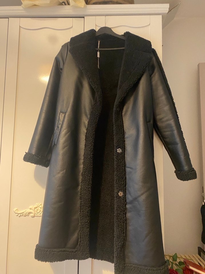 Siyah deri kadın ceketin uzun kesimi ve kürklü detayları bulunur. Notch yakalı ve uzun kolludur, günlük kullanıma uygun rahat bir kesime sahiptir.