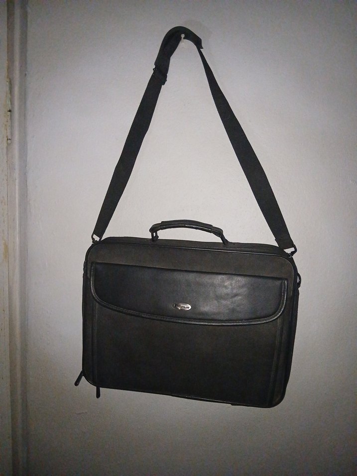 Siyah deri, tokalı askılı kadın laptop çantası. Goth tarzında, iş kullanımı için uygun, sade ve desensiz model.