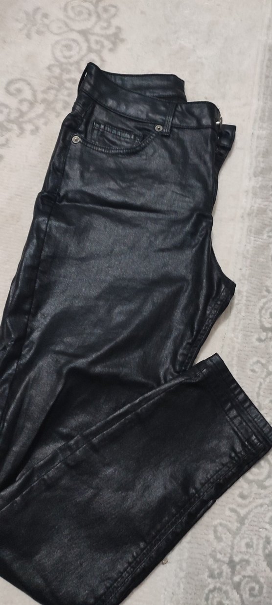 Siyah, tokalı detaylara sahip, dar kesim deri midi pantolon. Günlük kullanıma uygun, desen içermeyen şık goth tarzı pantolon.