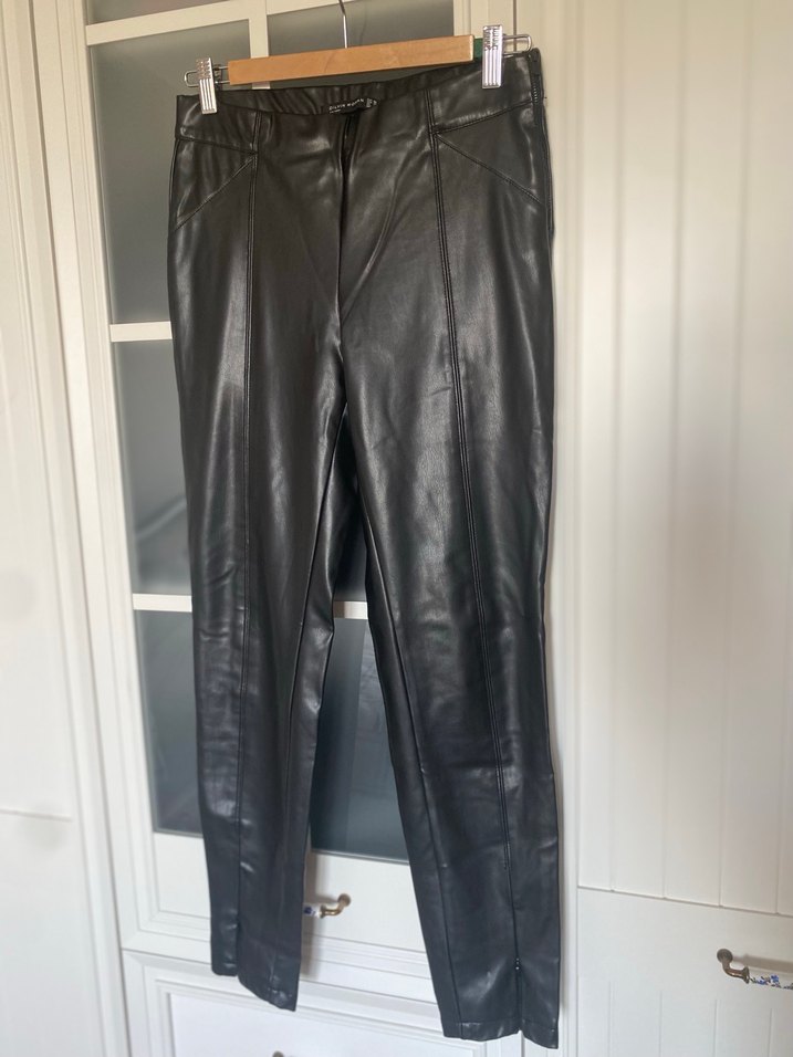 siyah deri midi pantolon. Paçanın ön kısmında fermuar detaylı . Önde dikiş detaylı