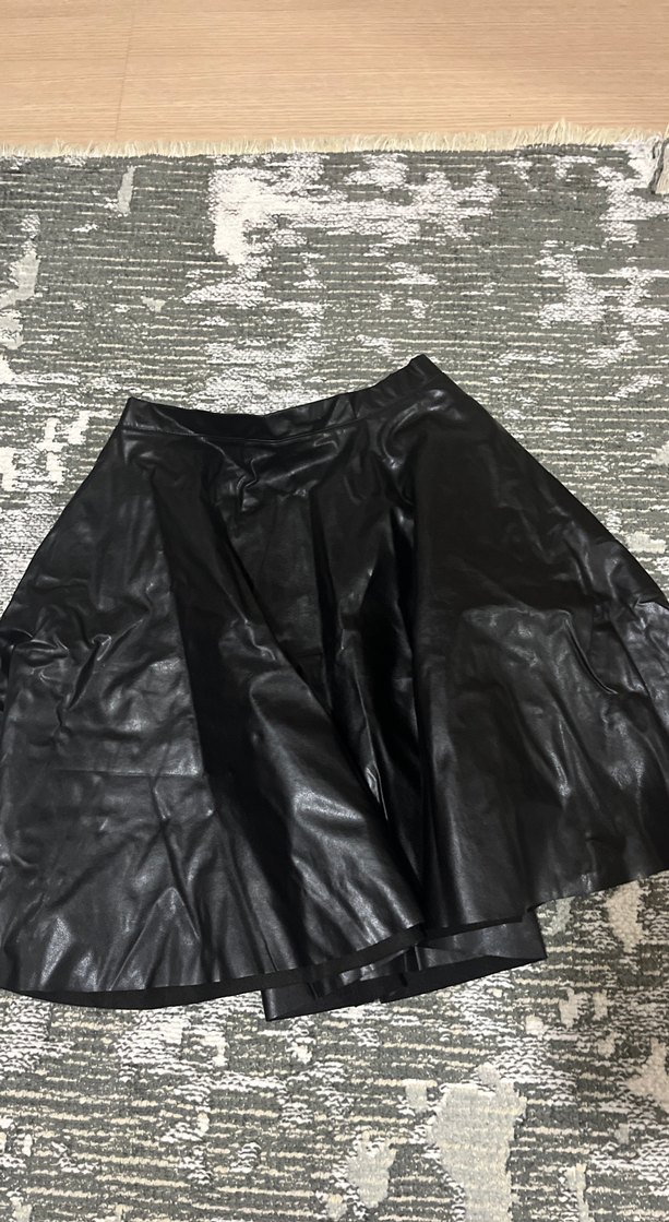 Siyah deri kadın midi şort, drapeli ve bol kesim tasarıma sahip, gotik tarzda ve günlük kullanıma uygun.